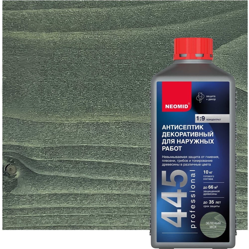 Декоративный антисептик для наружных работ Neomid 445 1 кг, зеленый мох Н-445-1/зел.м предназначен для обработки деревянных строительных конструкций и пиломатериалов, не контактирующих с пищей, эксплуатируемых снаружи и внутри помещений. Обеспечивает эффективную долговременную защиту древесины, используемой для строительных работ, в том числе при длительном контакте с грунтом и влагой. Невымываемая защита от гниения, плесени, грибов и тонирование древесины в различные цвета. Расход: 150 - 250 г/кв. м для строганой древесины; для пиленой древесины 250 - 400 г/кв. м.