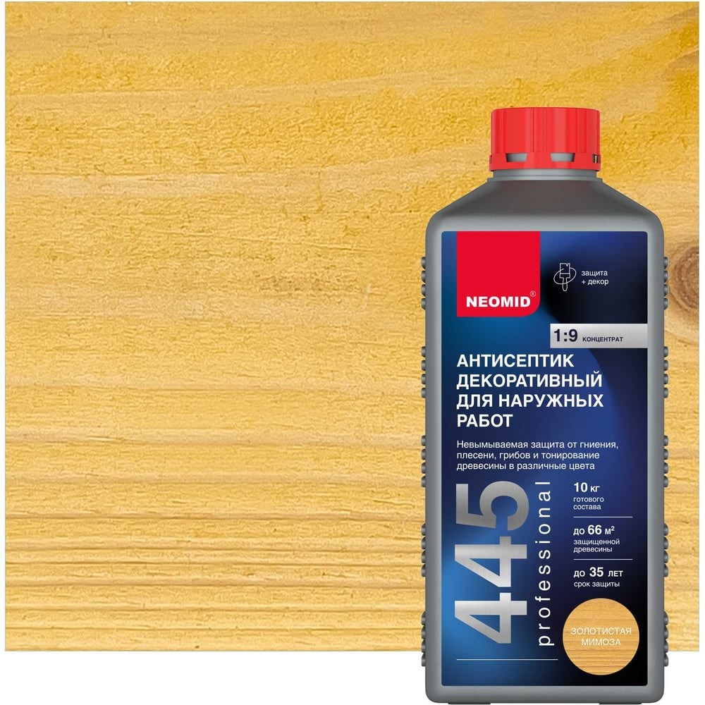 Декоративный антисептик для наружных работ NEOMID 445 1 кгзолотистая мимоза Н-445-1/зол.мим предназначен для обработки деревянных строительных конструкций и пиломатериалов, не контактирующих с пищей, эксплуатируемых снаружи и внутри помещений. Обеспечивает эффективную долговременную защиту древесины, используемой для строительных работ, в том числе при длительном контакте с грунтом и влагой. Невымываемая защита от гниения, плесени, грибов и тонирование древесины в различные цвета. Расход: 150 - 250 г/кв. м для строганой древесины; для пиленой древесины 250 - 400 г/кв. м.