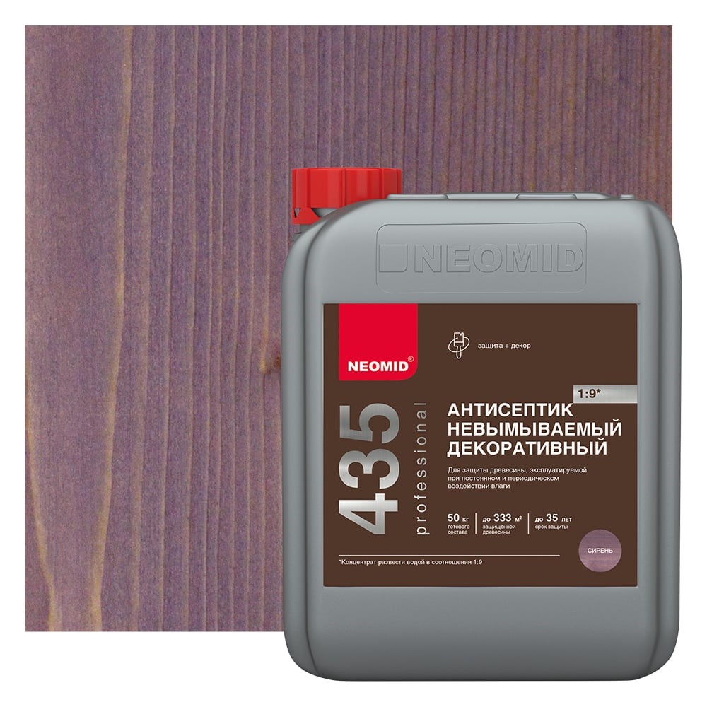 Декоративный невымываемый антисептик NEOMID 435 5 кг, сирень Н-435-5/к1:9 сир. обеспечивает максимальную защиту различных пород древесины в тяжелых условиях эксплуатации, в том числе при длительном контакте с грунтом и влагой. Предназначен для наружных и внутренних работ. Благодаря составу, продукт надежно защищает материал от поражения дереворазрушающими и деревоокрашивающими плесневыми грибами, водорослями, мхами, а также насекомыми-древоточцами на срок до 35 лет. Расход: для струганой древесины 150 - 250 г/кв. м; для пиленой древесины 250 - 400 г/кв. м.
