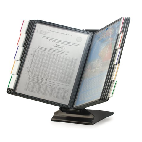 10 двухсторонних панелей серого цвета позволяют разместить одновременно до 20 листов формата А4. Прочные и гибкие литые рамки панелей изготовлены из полипропилена, пригодного для повторной переработки и дальнейшего использования. Демопанели оснащены съемными ярлычками-табуляторами для маркировки и удобного поиска нужной информации. Карман демопанели из прочного прозрачного материала с антибликовым покрытием надежно защитит документы от внешних воздействий. Наклонное расположение панелей и устойчивое металлическое основание гарантируют удобство пользователю и быстрый доступ к документу. Возможно настенное размещение.Стильный черный цвет металлического корпуса подойдёт для большинства современных интерьеров.