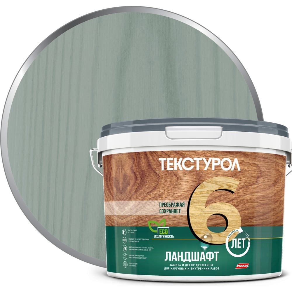 Деревозащитное средство ТЕКСТУРОЛ Ландшафт серо-зеленый, 9 л Лк-00011995 используют внутри и снаружи помещений для финишной обработки фасадов и конструкций из ДВП, ДСП, фанеры и шпона (стеновые панели, оконные и дверные проемы, заборы и ограды). Продукт создает на поверхности дышащую шелковисто-матовую пленку с водо- и грязеотталкивающими свойствами, устойчивостью к ультрафиолету и атмосферному воздействию. Тиксотропный состав не разбрызгивается и не образует подтеков при вертикальном нанесении. Противогрибковые добавки препятствуют развитию микроорганизмов, гниению и дальнейшему разрушению древесины. Благодаря технологии "Антиблок", подходит для окраски плотно соприкасающихся поверхностей, например, дверей и оконных рам, так как не дает окрашенным поверхностям слипаться.