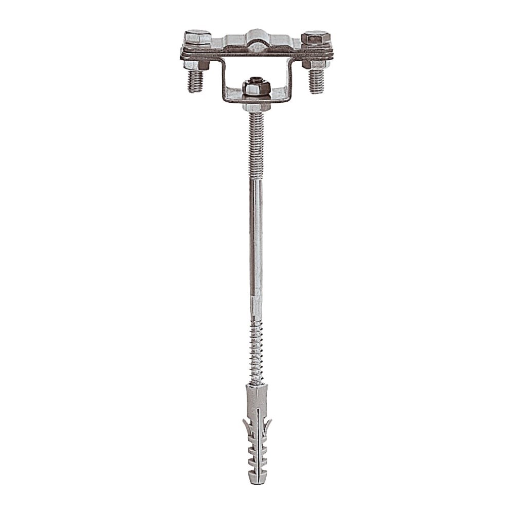 Держатель EZETEK полоса/пруток для бетонного фасада, оцинковка 91032 закрепляет пруток либо полосу токоотводов молниезащиты на бетонном фасаде. Изделие выполнено на основе держателя полоса/пруток, закрепленного на шпильке с резьбой по бетону, которая имеет дюбель для фиксации шпильки в бетонной конструкции. Проводник закрепляется при помощи держателей на расстоянии 120 мм от фасада.