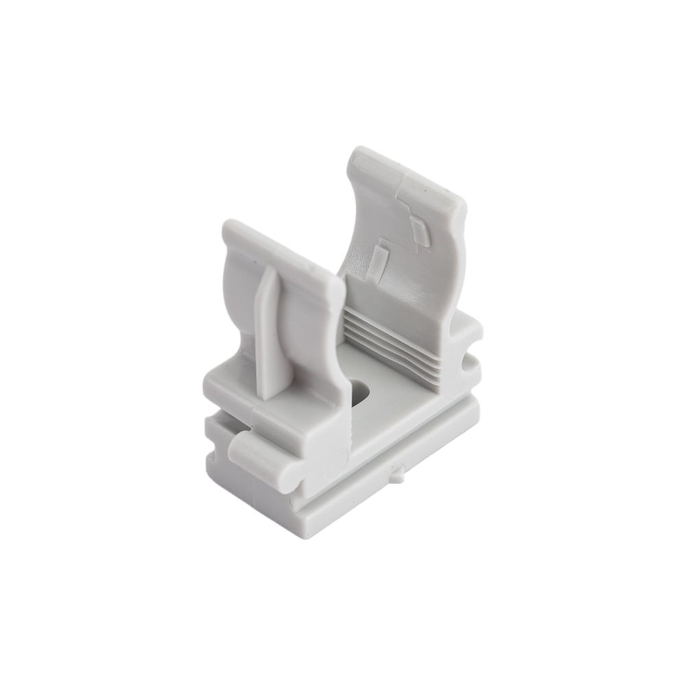 Крепление гофрированной трубы или жесткой гладкой трубы к поверхности стен, потолков, полов или перегородок с помощью монтажного пистолета. Диаметр ствола монтажного пистолета: 11мм. Предусмотрен вариант блочного монтажа держателей различных диаметров. Материл: АБС-пластик.