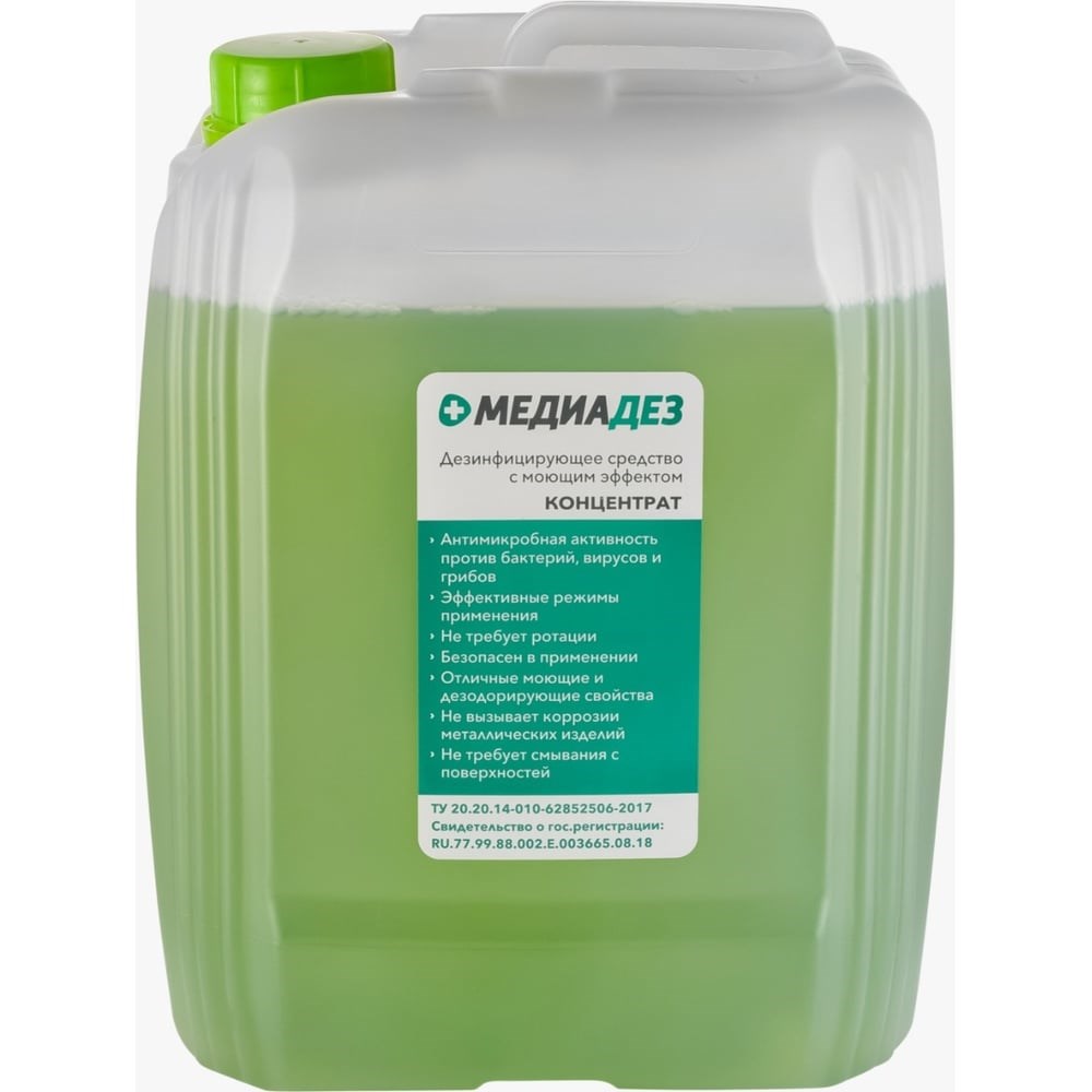 Дезинфицирующее средство АЛМАДЕЗ Медиадез 5 л концентрат МДЗ-301 - дезинфицирующее средство широкого спектра действия с моющим эффектом. Представляет собой прозрачную жидкость без механических примесей от жёлто-зеленого до зелёного цвета со слабым специфическим запахом или запахом применяемой отдушки. Хранение и транспортировка: Средство транспортируют всеми видами транспорта в соответствии с правилами перевозки грузов, действующими на каждом виде транспорта. Хранить средство отдельно от лекарственных средств, в местах недоступных для посторонних лиц и животных при температуре от -35 °С до +35 °С. Средство замерзает при отрицательной температуре, после размораживания сохраняет свои свойства. Срок хранения рабочего раствора - 35 суток.