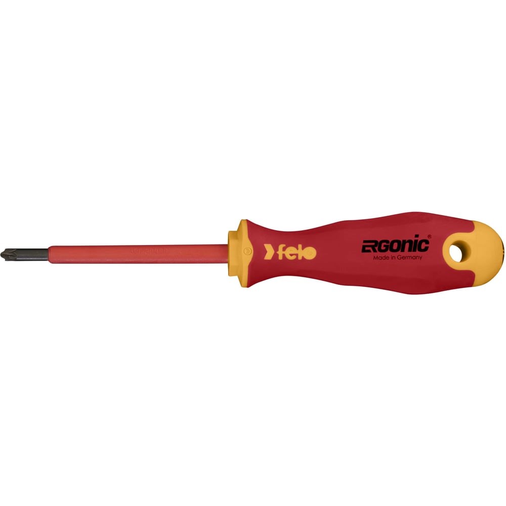 Диэлектрическая крестовая отвертка Felo Ergonic +/- Z 1X 80 41710290 применяется в сфере электротехнических работ под напряжением до 1000В. Инструмент устойчив к деформации и коррозии, имеет высокий рабочий ресурс. Стержень отвертки выполнен из хром-молибден-ванадиевой стали. Трехкомпонентная рукоятка отличается удобством использования. Она изготовлена по технологии ERGONIC, благодаря которой приспосабливается под руку пользователя. На рукоятке есть отверстие для подвешивания, чтобы обеспечить удобное хранение инструмента.