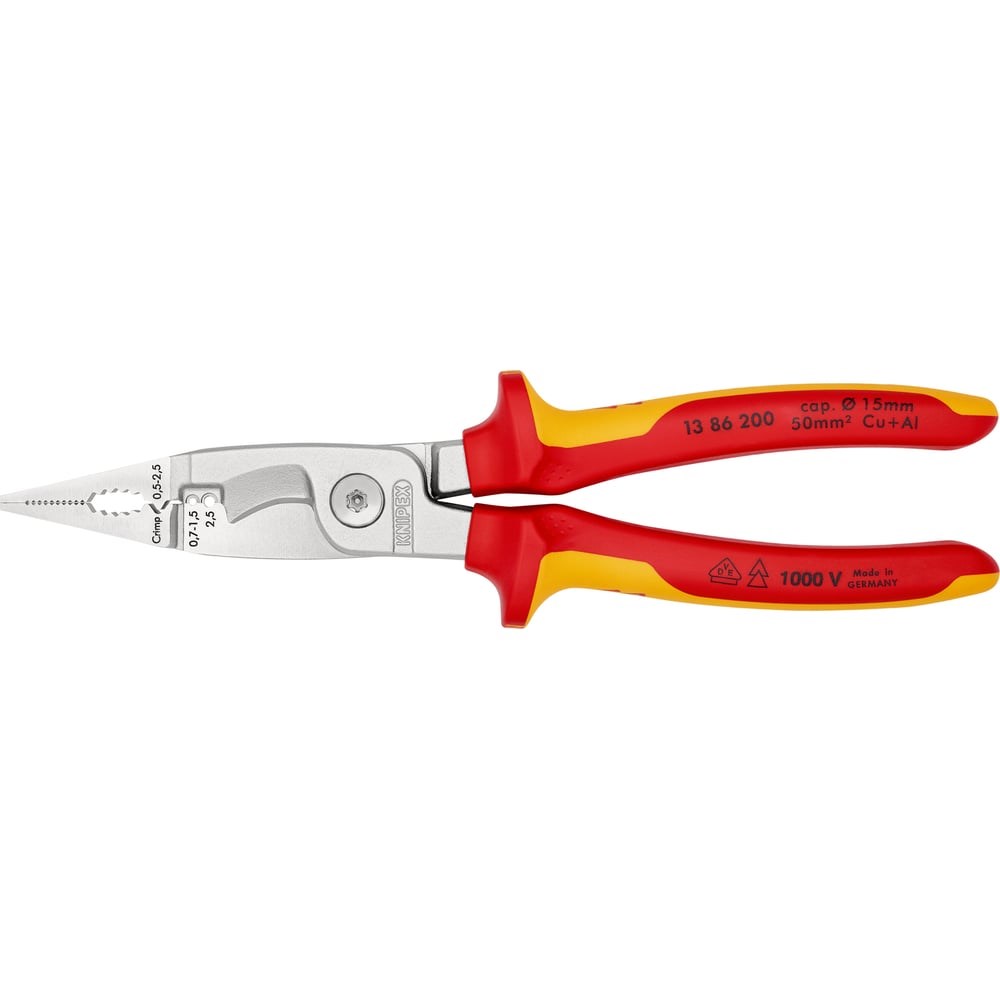 Электромонтажные клещи Knipex VDE, 6-в-1, 200 мм, диэлектрические, хром, 2К ручки, KN-1386200SB используются для электромонтажных работ- для захвата плоского и круглого материала, гибки, удаления заусенцев, резки кабеля, удаления изоляции и опрессовки контактных гильз 6 функций в одних клещах Гладкие захватные губки для захвата отдельных жил без их повреждения- профилированные захватные губки и выемка для захвата плоского и круглого материала Характерная наружная кромка на губке для обработки штепсельных розеток для скрытой проводки и удаления заусенцев на отверстиях для ввода кабеля Отверстия для удаления изоляции с проводов 0,75 - 1,5 кв.мм и 2,5 кв.мм Опрессовочное гнездо для контактных гильз 0,5 - 2,5 кв.мм Ножницы с прецизионными лезвиями (индуктивной закалки) для резки медного и алюминиевого кабеля до 5 x 2,5 кв.мм / диам. 15 мм Захватывают без полного раскрытия клещей (рациональный механизм удержания в закрытом состоянии у версии с раскрывающей пружиной). Узкая конструкция облегчает доступ к детали Винтовой шарнир: точный ход без зазоров В моделях с разжимающей пружиной закрытие защёлки приводит к смыканию лезвий, но не блокирует другие функции Модель с блистерным подвесом для торгового оборудования Безопасность, проверенная VDE (Союз немецких электриков), до 1000 В
