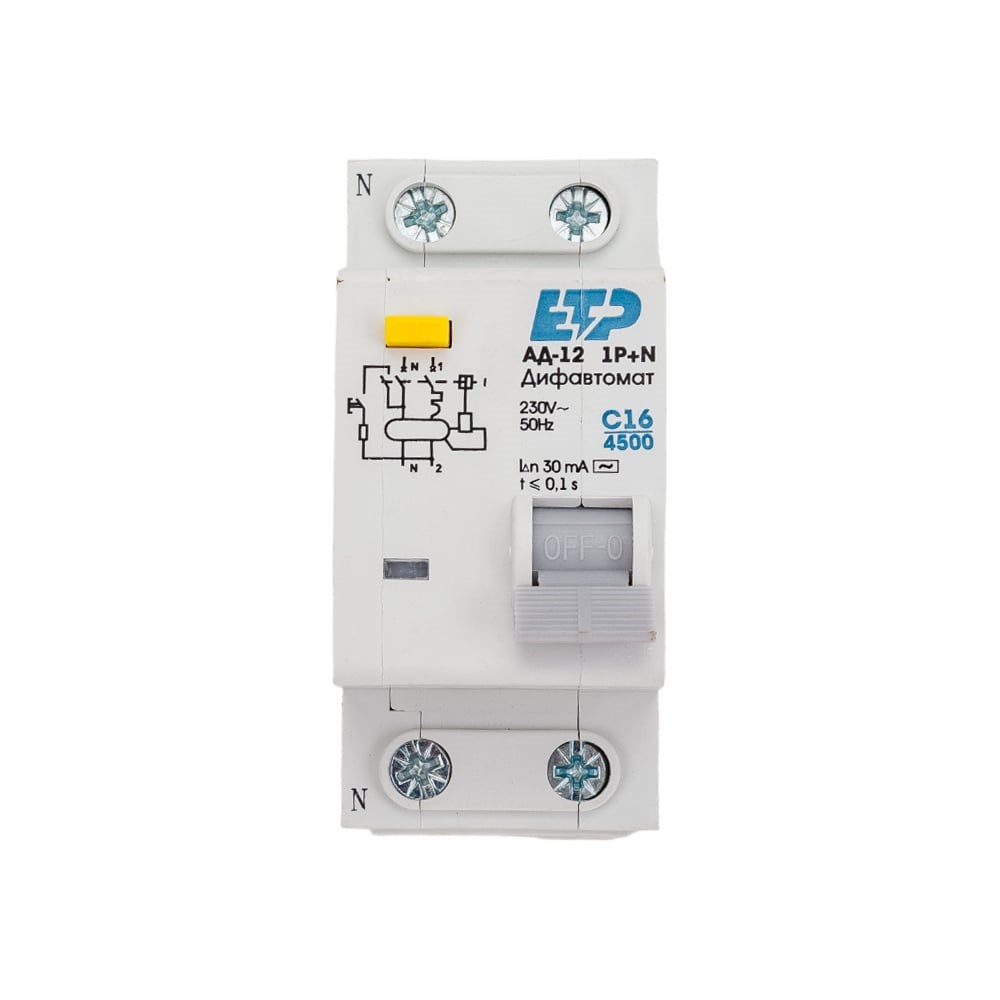 Дифференциальный автомат ETP 1P+N 16А тип АС 30 мА 4,5 кА 19012 представляет собой аппарат, сочетающий функции автоматического выключателя с устройством защитного отключения. При обнаружении автоматическим выключателем в защищаемом участке сети тока утечки (повреждения) на землю или сверхтока (тока перегрузки или короткого замыкания) происходит срабатывание устройства, приводящее к отключению защищаемой сети. Таким образом, дифференциальный автоматический выключатель серии АД-12 применяется для: Проведения тока в нормальном режиме. Отключения тока при коротких замыканиях или перегрузке. Отключения тока при прикосновении человека к токоведущим частям электроустановок или протекании дифференциального (утечки) тока на землю. Защиты электрооборудования (ЭО) при повреждении изоляции проводников и неисправностях ЭО. Предотвращения возгораний и пожаров, возникающих вследствие протекания токов утечки и развивающихся из них коротких замыканий, замыканий на корпус и замыканий на землю.