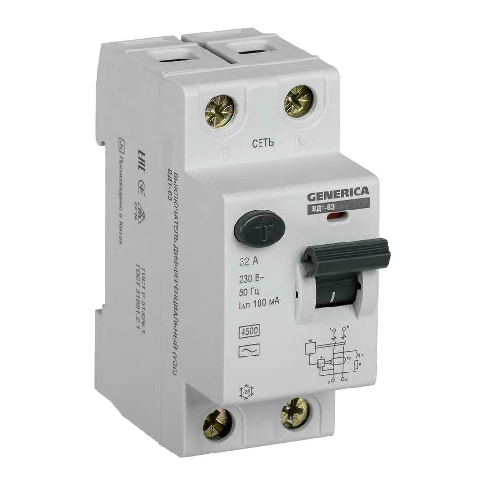Дифференциальный выключатель Generica УЗО ВД1-63