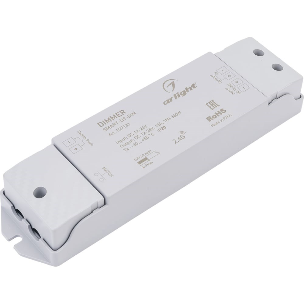 Дополнительные характеристики Диммера Arlight SMART-D9-DIM 0 27133: Связь пульт/контроллер - RF радио Частота передачи данных - 2400 MHz Выходной сигнал - PWM(ШИМ) CV Частота ШИМ - 500 Hz Каналы управления - 1 CH (1 канал Mono) Ток нагрузки - max: 15 A Выходная мощность - min: 180 W; max: 360 W