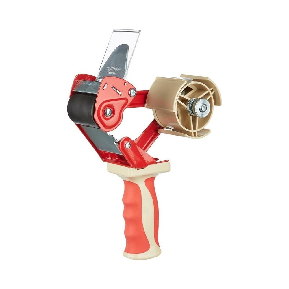 Металлический корпус. Эргономичные пластиковые рукоятки. Бордового цвета с красно-белой ручкой. Вес - 0.615 кг. Длина намотки - до 200 м. Встроенный механический нож, выдвигающийся только при нажатии на рычаг. Металлический пружинный регулятор усилия разматывания ленты.