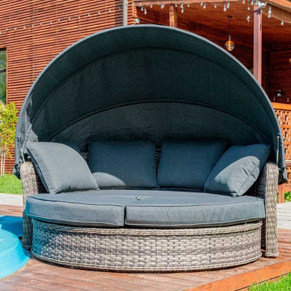 Диван-трансформер Violetta из искусственного ротангаСадовый диван Violetta (Виолетта) из искусственного ротанга станет прекрасным местом для комфортного отдыха Вас и Вашей семьи под открытым небом. Удобный круглый шезлонг-трансформер Violetta, можно легко трансформировать из круглой кровати в компактный и стильный диван, убирая переднюю часть под основную , а солнцезащитный козырек из ткани позволит Вам наслаждаться свежим воздухом даже под палящим солнцем. При его изготовлении мы использовали прочный алюминиевый каркас с декоративной отделкой из круглого и плоского искусственного ротанга, что обеспечило улучшение технологический характеристик. Конструкция способна выдерживать высокие весовые нагрузки; устойчивость к механическому воздействию; достаточно маленький вес для легкой переноски; съемные чехлы на подушках обеспечат простоту ухода.Характеристики:Диаметр — 195 смВысота — 102 / 74 см.Цвет ротанга — серо-бежевыйЦвет подушек — серый