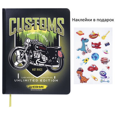 Дневник 1-4 класс 48 л., кожзам (твердая с поролоном), печать, наклейки, ЮНЛАНДИЯ, "Мотоцикл", 106186