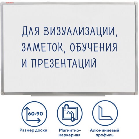 Доска магнитно-маркерная 60х90 см, алюминиевая рамка, ГАРАНТИЯ 10 ЛЕТ, РОССИЯ, BRAUBERG Стандарт, 235521