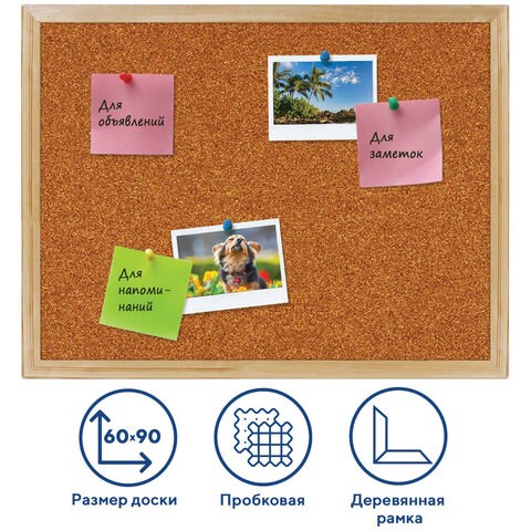 Доска пробковая для объявлений 60х90 см, деревянная рамка, ГАРАНТИЯ 10 ЛЕТ, РОССИЯ, BRAUBERG, 236860