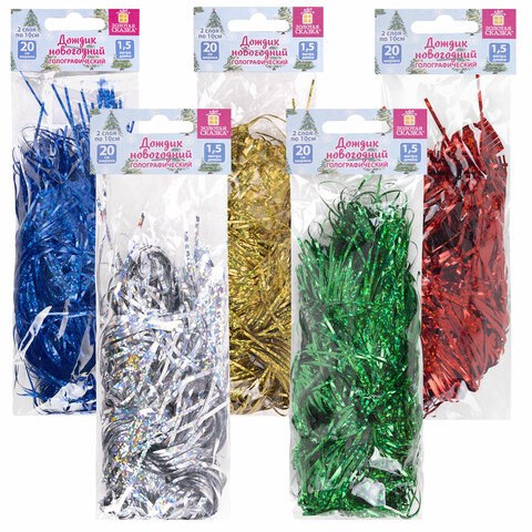 Дождик новогодний голография 1 шт., ширина 20 см (2 слоя по 10 см), длина 1,5 м, ассорти 5 цветов, ЗОЛОТАЯ СКАЗКА, 592288