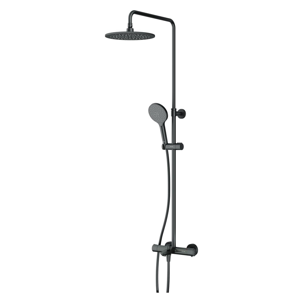 Душевая система AM.PM Like смеситель для ванны и душа с термостатом, 3 функции, черный F0780522 - тотальный дизайн в действии: все детали душевой системы – от пропорций ручного и верхнего душей до рисунка расположения форсунок на лейках – подчинены единой концепции в ультрамодном стиле Dynamic Organic. Продуманные детали для удобства использования: штанга регулируется по высоте в диапазоне от 1030 до 1460 мм, обеспечивая комфорт для людей любого роста, шаровый шарнир в держателе верхнего душа позволяет регулировать угол его наклона. Смеситель для ванны и душа с термостатом: термостатический картридж с высокочувствительным термоэлементом, стопором безопасности на 38 градусов, быстрой реакцией на изменения температуры или давления надежно защищает от ожога даже при внезапном отключении холодной воды.