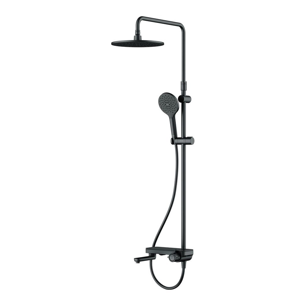 Тотальный дизайн в действии: все детали душевой системы – от пропорций ручного и верхнего душей до рисунка расположения форсунок на лейках. Премиальные размеры и продуманные детали: увеличенный диаметр душевых леек (верхний душ 220 мм и ручной душ 120 мм) позволит ощутить преимуществатропического душа, тогда как увеличенная длина шланга 1750 мм обеспечит свободу движений во время принятия душа. Телескопическая поворотная штанга регулируется по высоте в диапазоне от 1030 до 1460 мм, обеспечивая комфорт для людей любого роста, а шаровой шарнир в держателе верхнего душа позволяет регулировать угол его наклона. Смеситель выполнен в виде полочки. Чистый дизайн без лишних деталей: переключатель расположен за ручкой настройки температуры и позволяет менять источник потока воды от ручной лейки и излива до верхнего душа.
