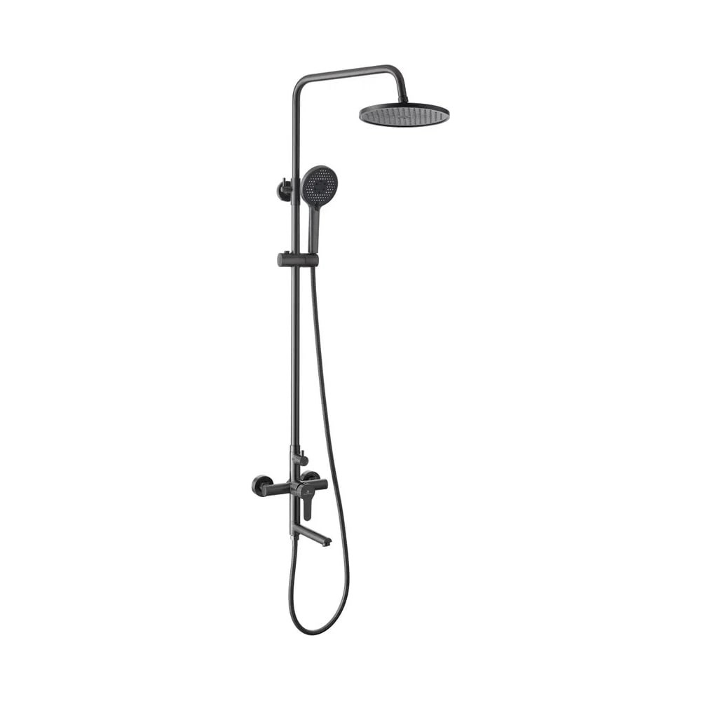 Душевая система 3-х функциональная (в комплекте со шлангом и душевой лейкой, тропической лейкой) - Высота штанги: 892 -1202мм - Вылет штанги: 350мм - Тропическая лейка: 230мм - Лейка для душа (ручная): d-115мм - Шланг: длина 1,5 м - Картридж: d-35мм, с керамическими пластинами, шумопоглощающий - Стойка: нержавеющая сталь - Корпус смесителя: нержавеющая сталь - Цвет: оружейная сталь - Покрытие: PVD - Дивертор с керамическими пластинами (угол поворота 360 градусов) В комплекте: эксцентрики и декоративные накладки.