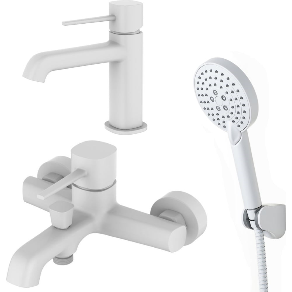 Набор смесителей для ванной комнаты Karl от немецкой компании Orange – отличный выбор для интерьера в стиле минимализм.Латунное изделие устойчиво к коррозии и высоким температурам, а белое глянцевое покрытие делает незаметными разводы и высохшие капли. Керамический картридж обеспечивает долговечность изделия, стабильную подачу воды и мощный напор. Излив оснащен пластиковым аэратором, он создает ровную мощную струю и легко очищается от известкового налета.В комплекте душевой набор: душевая лейка d 110 мм (3 режима струи, защита от известкового налета RUB CLEAN, с системой AIR IN), шланг в металлической оплетке 1500 мм с защитой от перекручивания, настенный держатель лейки с регулировкой угла наклона.