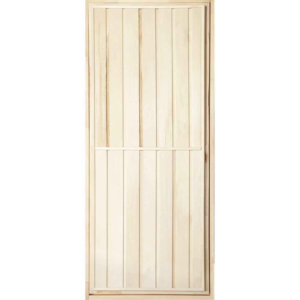 Дверь для бани Банная линия глухая с фольгой, 1.9x0.7 м, липа, класс Б, коробка из липы, петли 12-933 используется в бане или в сауне. Изготовлена из натурального дерева, не боится высоких температур. Внутри двери находится фольга, которая помогает сохранять тепло в помещении. Размер: 1.9х0.7 м.