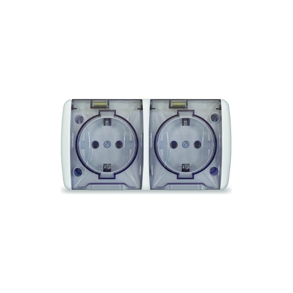 Двухместная розетка UNIVersal Клио с прозрачной крышкой, IP54, 16А, 220В, белая еврослот К2232 идеально подходит для эксплуатации в сырых помещениях, подвалах, гаражах, мастерских, а также под навесом на открытом воздухе. Наличие герметичных вводов с двух сторон дает возможность подключения изделия как сверху, так и снизу, а большое пространство между задней панелью и механизмом обеспечивает свободное подключение проводов.