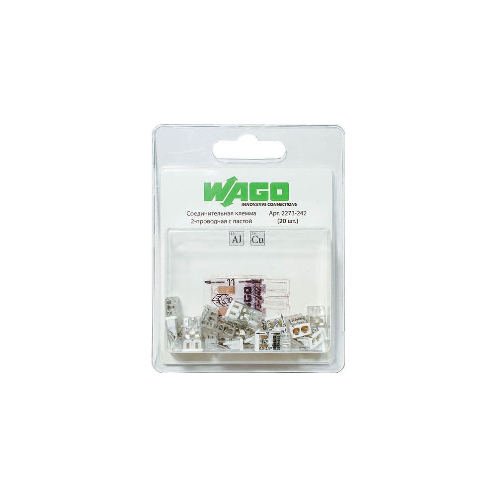 Соединительная клемма для быстрого монтажа WAGO 2273-242 2-х проводная, 0,5-2,5 кв.мм, 450В, 24А, с пастой, 20шт 2540 предназначена для соединения медных или алюминиевых одножильных проводников. Компактные размеры клемм позволяют использовать их в условиях ограниченного пространства. Прозрачный корпус позволяет визуально контролировать правильность положения проводника и длину снятия изоляции. Проводящая часть соединителя изготовлена из меди.
