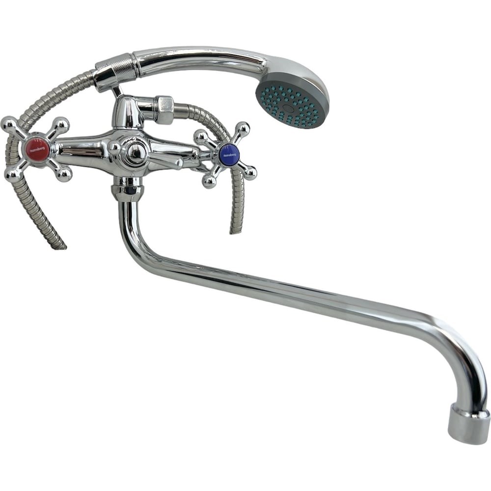 Смеситель для ванны с поворотным изливом длиной 30 см. Установка представленной модели производится на эксцентрики, которые закрываются отражателями. Аэратор в смесителе поможет обеспечить равномерный поток воды, а также ее смягчение. Специальная сетка в устройстве отфильтровывает разнообразные примеси. Настенный смеситель – это традиционный вариант, который на сегодняшний день чаще всего ставится в ванной комнате. Кроме обычного излива в комплекте имеется душевой шланг длиной 145 см с душевой однорежимной лейкой.