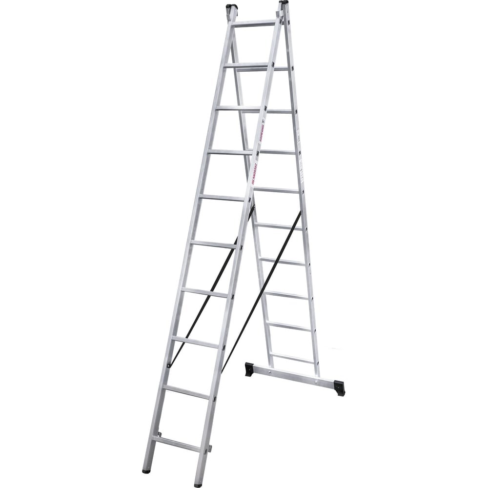 Двухсекционная лестница Новая Высота 2х10 ступеней 1220210 универсальна для работы на любом типе поверхности. Конструкция позволяет применять её как приставную лестницу, приставную выдвижную лестницу, стремянку. Защиту от скольжения обеспечивают пластиковые наконечники. Многократная развальцовка в соединении ступеней со стойками обеспечивает высокую прочность и долговечность.