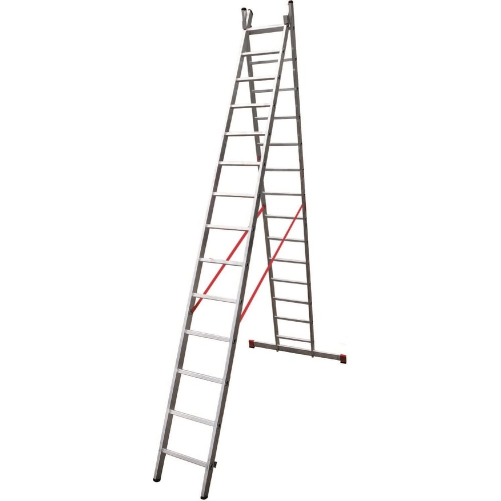 Двухсекционная лестница Новая Высота 2х14 604214 оборудована нескользящими наконечниками из пластика, что гарантирует ее статичное положение при проведении строительных, монтажных и ремонтных работ. Универсальная модель легко принимает форму приставной односекционной лестницы, приставной раздвижной лестницы и стремянки, что обеспечивает рабочую высоту 4.93 м, 7.27 м и 5.18 м соответственно. Траверса крепится при помощи стальных болтов, что позволяет снять ее для более удобной транспортировки - эта операция уменьшает ширину лестницы более, чем вдвое (с 1 м до 40 см). Рельефные ступени значительно снижают уровень травматизма пользователя при работе на улице в осенне-зимний период.