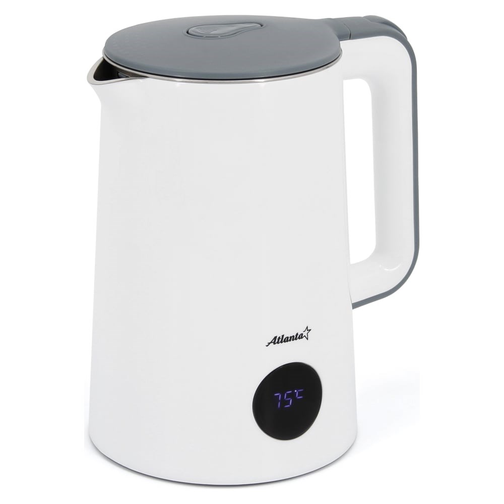 Двухстенный электрический чайник Atlanta ATH-2447 white предназначен для кипячения и подогрева воды. ДВОЙНЫЕ СТЕНКИ. Корпус чайника сделан по новой технологии композиции нержавеющей стали и пластика. Чайник имеет преимущества перед изделиями из нержавеющей стали такие как прочность, долговечность и 100% экологическая чистота. А также высокую термоизоляцию, что более типично для изделий из пластика. CОВРЕМЕННЫЙ ДИЗАЙН. Чайник выполнен в минималистичном дизайне. Благодаря современной форме корпуса и ручки, цветовому исполнению (сочетание белого и серого) такой чайник легко впишется в любой интерьер. ЗАКРЫТЫЙ НАГРЕВАТЕЛЬНЫЙ ЭЛЕМЕНТ. Может вскипятить быстро необходимое количество воды. Изготовлен из высокопрочной стали, что позволяет его чистить от накипи обычной щеткой. ДИСПЛЕЙ. Чайник оборудован дисплеем, на котором отображается температура воды в чайнике.