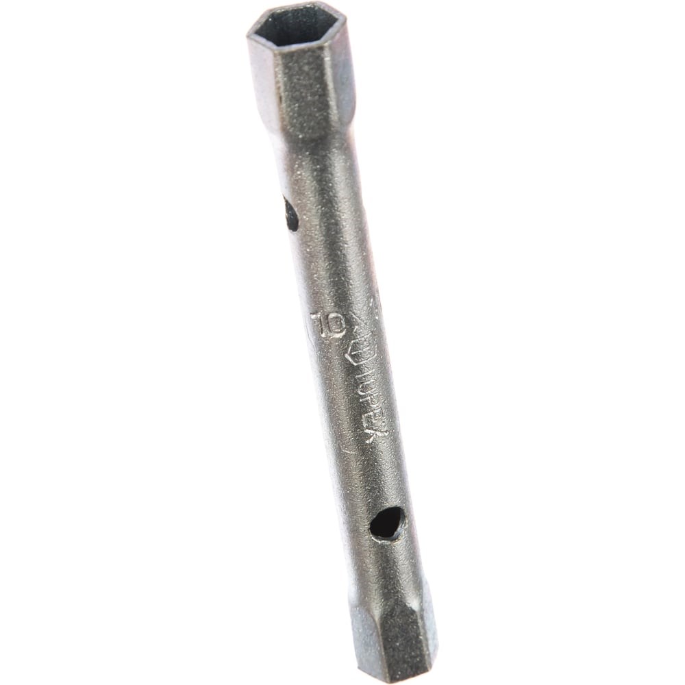 Торцевой двухсторонний ключ TOPEX 10x11 мм 35D932 изготовлен из стали, обладающей прочностью и долговечностью. Он используется с целью монтажа и демонтажа резьбовых соединений. Ключ приводится в движение воротком, который вставляется в отверстия, расположенные на корпусе. Размер шестигранных головок - 10 и 11 мм.
