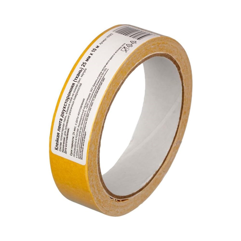 Двухсторонняя клейкая лента ООО Комус 25 мм х 10 м, ткань 767972 используется для склеивания гладких поверхностей и материалов при проведении монтажных, ремонтных, дизайнерских и оформительских работ. Клеевой слой на основе синтетического каучука. Максимальный вес прикрепляемого предмета - 80 г.