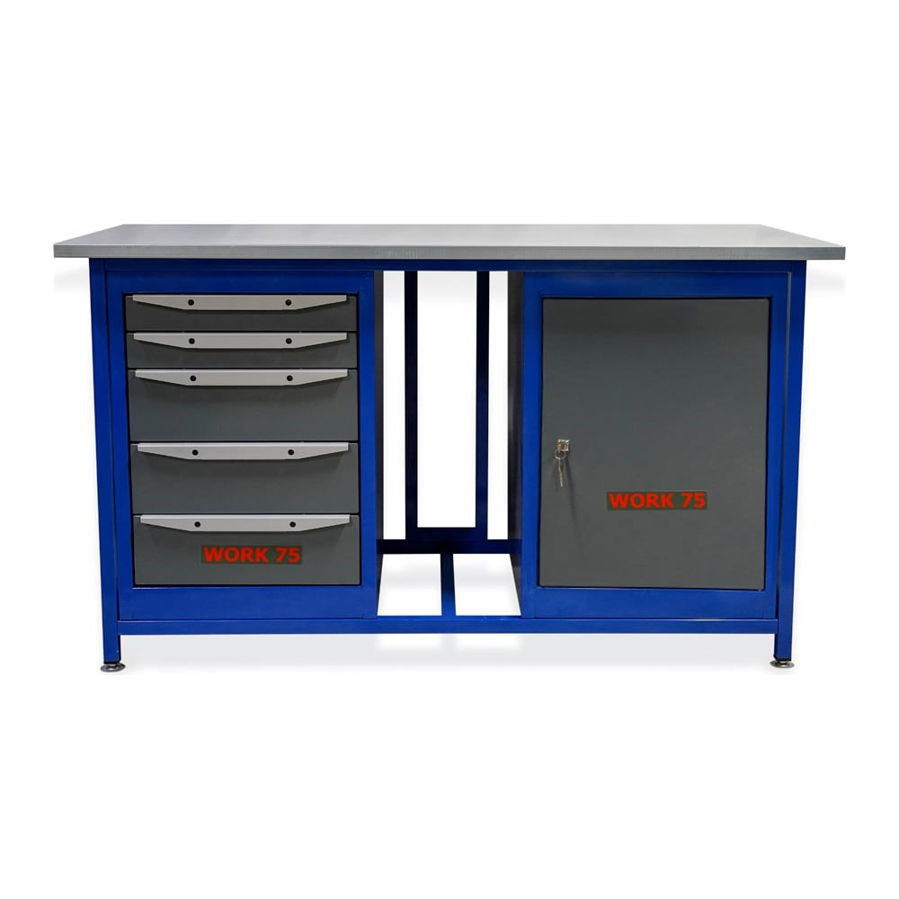 Двухтумбовый верстак WORK серии WK1500(Т0-Т5) используется для рациональной организации рабочего места при проведении различных сборочных и ремонтных операций. Верстак поставляется в разобранном виде, за исключением тумб, которые поставляются полностью собранными. Каркас верстака состоит из двух опор, верхней и нижней рам, а также рамки жесткости, изготовленных из стальной профильной трубы 30х30 мм. Каркас собирается с помощью стандартных болтов М8. Порошковое покрытие каркаса обеспечивает защиту от коррозии и долгий срок службы. Тумбы верстака комплектуются дверцей со съемной внутренней полкой, и пятью выдвижными ящиками двух типоразмеров по высоте. Дверцы запираются на почтовый замок. Ящики фиксируются механизмом центрального замка и могут запираться на навесной замок. Выдвижение ящиков осуществляется с помощью телескопических шариковых направляющих (типа развернутый подшипник) с креплением на зацепах. Вариант крепления направляющих на зацепах позволяет избежать наличия выступающих частей заклепок на внутренних поверхностях выдвижных ящиков, что важно при использовании покупных ложементов для укладки инструмента в ящике. Максимальная распределенная нагрузка на ящик 45 кг. В стенках тумб установлены жесткие упоры, предотвращающие выпадение нагруженных ящиков при резком выдвижении ящика в крайнее положение «на себя». Столешница изготовлена из фанеры 24 мм и закрыта стальным оцинкованным листом стали толщиной 1,2 мм. Максимальная распределенная нагрузка на столешницу до 350 кг.