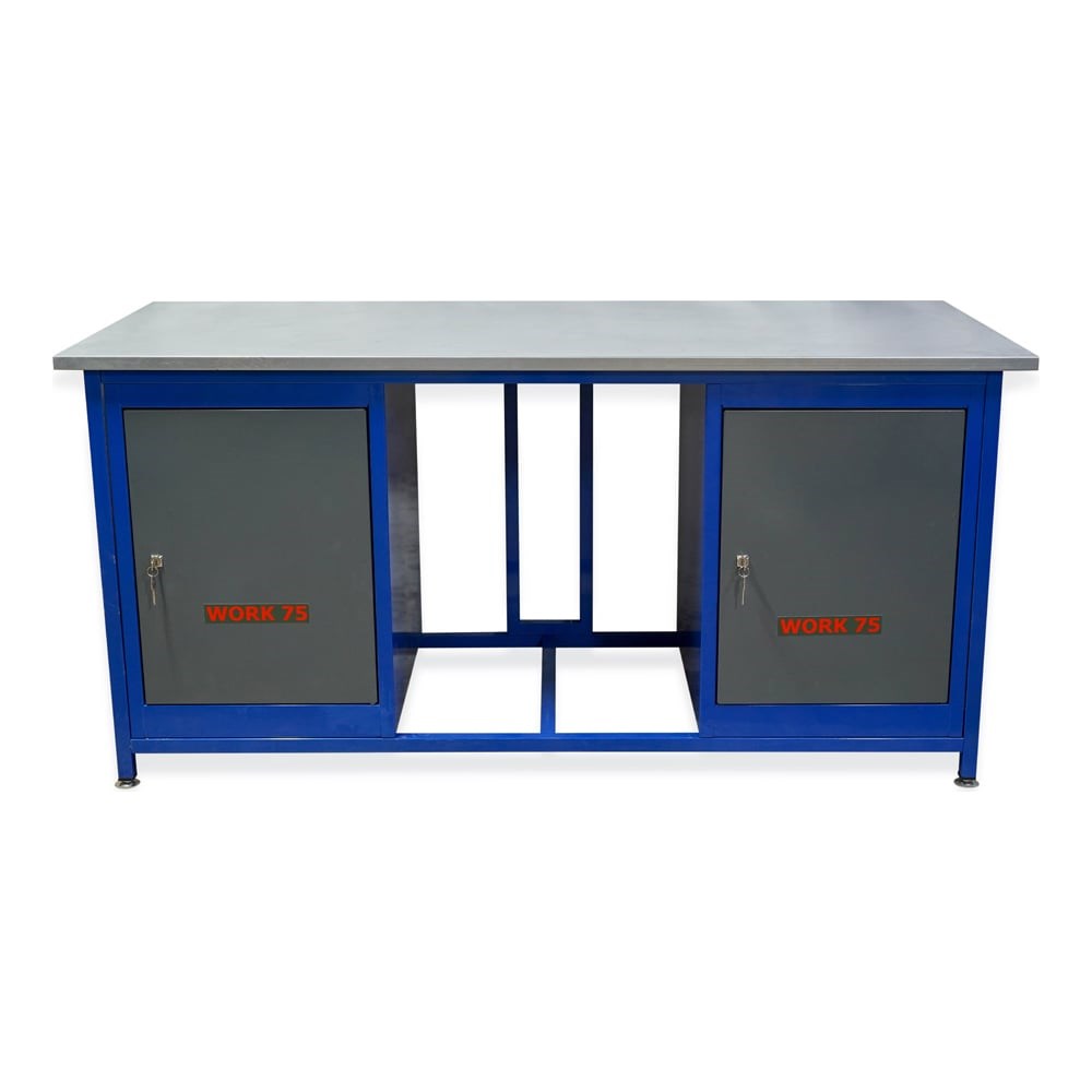 Двухтумбовый верстак WORK серии WK1800(Т0-Т0) используется для рациональной организации рабочего места при проведении различных сборочных и ремонтных операций. Верстак поставляется в разобранном виде, за исключением тумб, которые поставляются полностью собранными. Каркас верстака состоит из двух опор, верхней и нижней рам, а также рамки жесткости, изготовленных из стальной профильной трубы 30х30 мм. Каркас собирается с помощью стандартных болтов М8. Порошковое покрытие каркаса обеспечивает защиту от коррозии и долгий срок службы. Тумбы верстака комплектуются дверцами со съемной внутренней полкой. Дверцы запираются на почтовый замок. Столешница изготовлена из фанеры 24 мм и закрыта стальным оцинкованным листом стали толщиной 1,2 мм. Максимальная распределенная нагрузка на столешницу до 350 кг.
