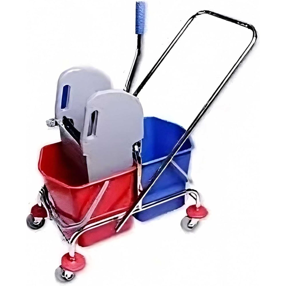 Тележка уборочная с механическим ручным отжимом H0203. Рама сварная хромированная, оснащена перекидной съемной П-образной ручкой для движения вперед и назад, чтобы не тратить силы на развороты в узких коридорах. Тележка оснащена надежными ведрами с пластиковыми ручками, цвет ведер синий и красный, объем каждого ведра 5 галлонов имеются шкалы уровня внутри каждого ведра. Отжим механический съемный для мопов кентукки, устанавливается на металлической перекладине между ведрами надежно фиксируется и не спадает. Поворотные колеса закручиваются и фиксируются на резьбе в раме. Края тележки в районе колес оснащены бамперами в виде тарелочек, для защиты мебели и стен от царапин и сколов при случайном ударе. Тележка универсальная может применяться для уборки в различных отраслях и учреждениях.