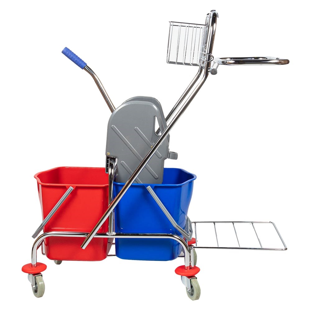 Тележка уборочная двухведерная предназначена для проведения влажной уборки на больших территориях, в офисах, складах, магазина и в производственных помещениях. Состоит из хромированного металла на колесах с двумя ведрами объемом по 17 л, механического отжима для мопов, креплением под мусорный мешок и корзинки для химии. Корпус тележки платформы изготовлен из хромированного металла. Тележка для уборки выполнена в двухцветном исполнении синее/красное. Колеса у тележки имеют высокую проходимость, и перемещение по любой территории. Перекидная ручка у двухведерной тележки позволяет оперативно изменить траекторию движения. Механический отжим с металлической ручкой подтверждает надежность механизма и продлевает эксплуатацию тележки.