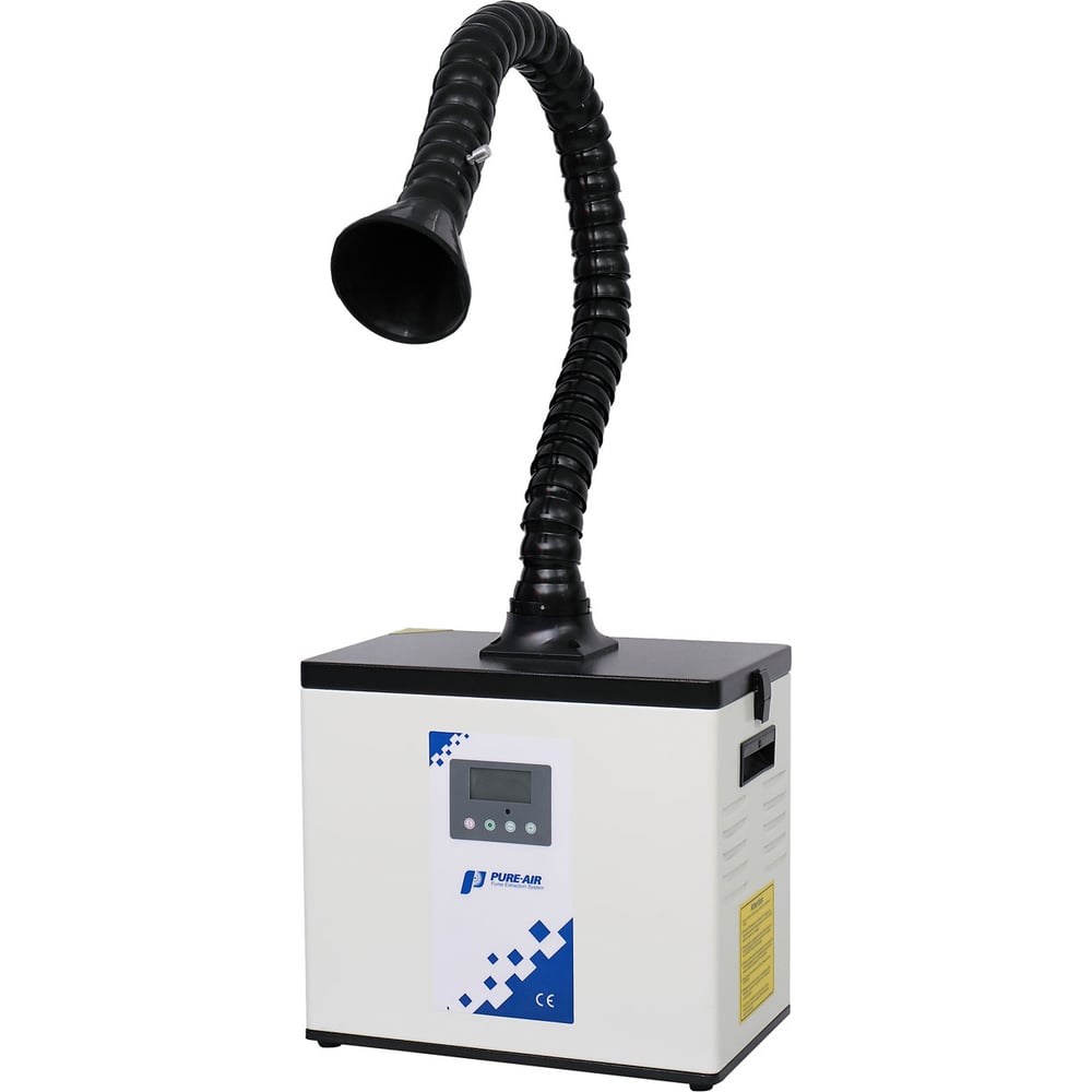 Компактный дымоуловитель на 1 рабочее место используется: В производстве электроники Подходит для фильтрации и очистки воздуха от дыма и вредных газов при ручной пайке, автоматической пайке, иммерсионном лужении, покрытии защитными лаками, работе с растворителями и других процессов на производстве печатных плат. Для лазерной обработки Подойдет для фильтрации воздуха, например, от маломощного настольного лазерного маркиратора или гравера со стационарной линзой, гравировки клавиатур, для косметического лазера и других задач с малым образованием пыли. В дымоуловителе используется надежный двигатель с электронным управлением. Вы можете выбрать нужный воздушный поток. Повысьте скорость, чтобы поднять эффективность, или выберите минимальную, чтобы снизить шум. Самым большим преимуществом бесщеточных вентиляторов является низкий уровень шума, стабильная работа, отсутствие обслуживания и длительный срок службы. Крыльчатка из специального сплава с множеством лопастей идеально сбалансирована на заводе. Металлическая конструкция не подвержена износу и деформации и прослужит вам долго. Жидкокристаллический ЖК-дисплей может отображать данные в режиме реального времени, такие как скорость вентилятора и объем воздуха. Единицу измерения объема воздуха можно переключать. При обнаружении засорения фильтра на ЖК-дисплее панели управления будет мигать символ предупреждения о засорении фильтрующего элемента и сработает звуковой сигнал. Сложная комбинация фильтров подходит для разных задач - от ручной пайки до лазерной обработки и салонов красоты. В системе используется последовательно 4 фильтра, которые можно и удобно менять отдельно. Первый фильтр - это префильтр грубой очистки для защиты следующего фильтра от крупной пыли. Далее располагается префильтр с эффективностью F8, он практически полностью очищает воздух от микронной пыли и аэрозолей. Основной HEPA фильтр совмещен с газовым угольным фильтром. HEPA фильтр очищает воздух от частиц 0.3мкм на 99.9% и задерживает наноскопические загрязнители. Последним очищает воздух от вредных газов угольный фильтр с пропиткой из специального катализатора. Стандартные суставчатые дымоприемники из полипропилена можно изогнуть так, чтобы они не мешали и доставали до источника загрязнений. Кроме того длину дымоприемника легко самостоятельно нарастить просто добавив к нему несколько секций. На выбор доступно несколько раструбов различной формы для разных задач. Для пайки поставляется оптимальный раструб прямоугольной формы.
