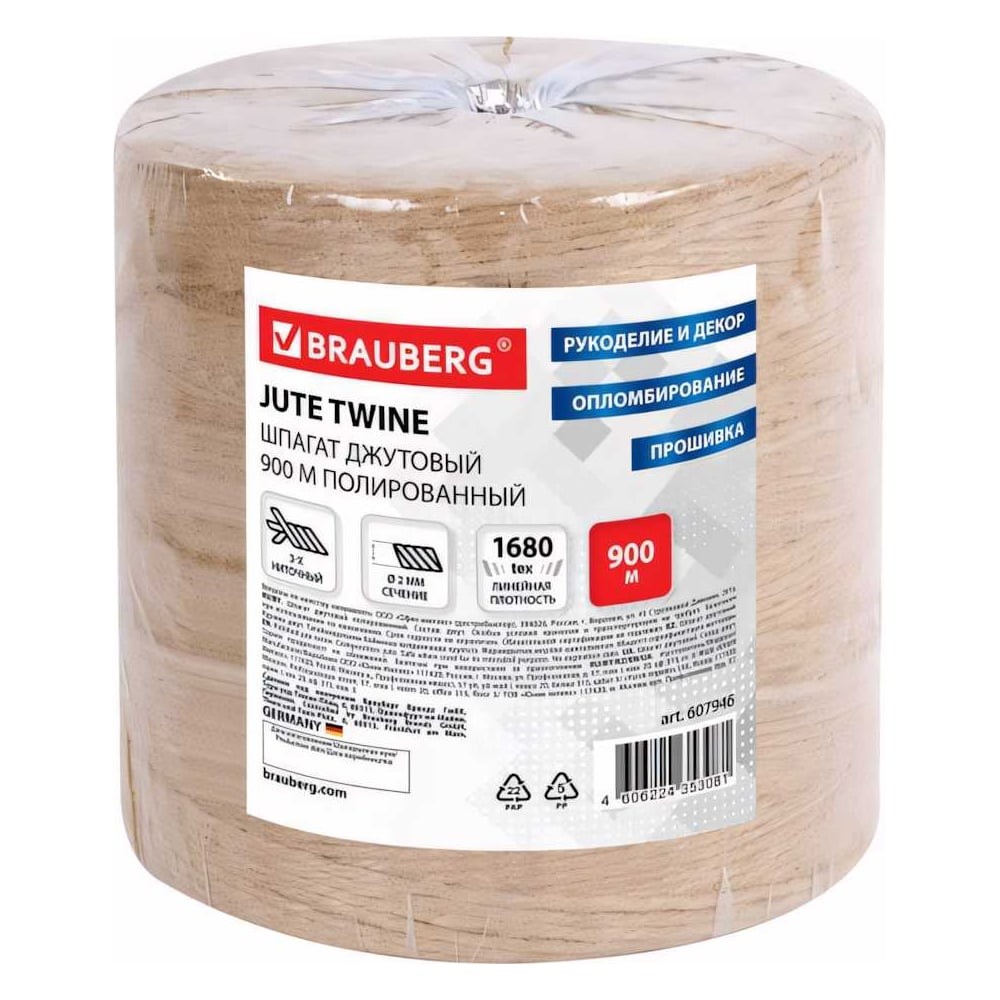 Джутовый полированный шпагат BRAUBERG длина 900 м, диаметр 2 мм, 3-х ниточный 607947 607946 подходит для рукоделия и декора, упаковки товаров, опломбирования и прошивки документов. Изготовлен из натурального сырья растительного происхождения, за счет чего безопасен в использовании. Отличается высокой прочностью, поэтому прослужит долгий срок. Имеет равномерную витую структуру без посторонних включений, не ворсится и не колется.