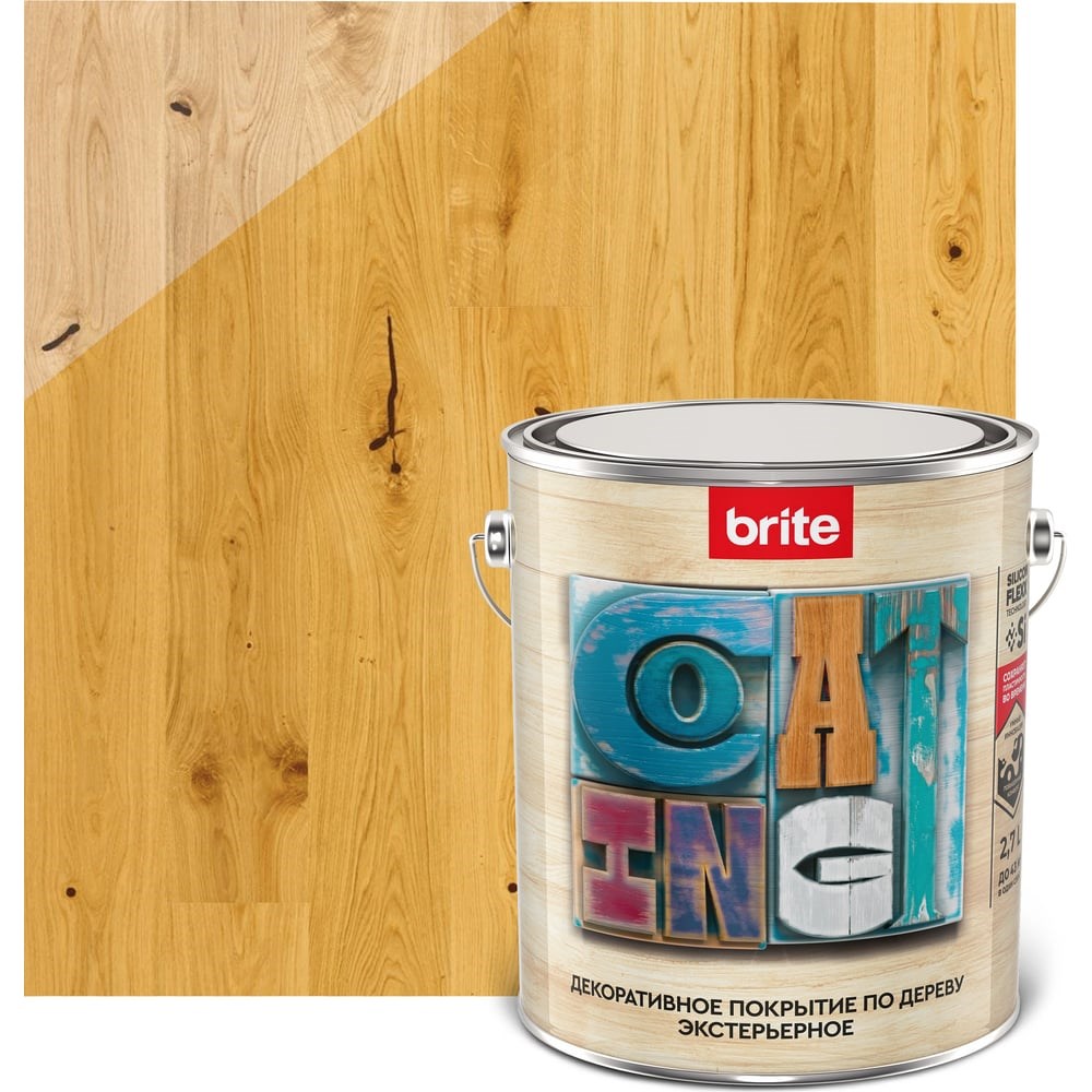 Декоративное покрытие по дереву BRITE FLEXX экстерьерное, орегон, ведро 2,7 л 212457 с УФ-фильтром применяется для отделки под ценные породы дерева поверхностей из строганой и пиленой древесины, а также для защиты от плесневых, деревоокрашивающих и дереворазрушающих грибов. Состав оптически подчеркивает и усиливает природную фактуру дерева, придает покрытию особую прочность и стойкость к неблагоприятным погодным условиям. Покрытие блокирует проникновение масляных и жировых загрязнений, препятствует их накоплению и обеспечивает лёгкое удаление дождём. Благодаря введению в состав светостойких пигментов, усиленных добавлением УФ-фильтра, обеспечивает наилучшую устойчивость к выцветанию. В течение всего гарантийного срока эксплуатации сохраняет первоначальную интенсивность цвета. Срок службы комплексного покрытия (грунт-основа по дереву Brite Flexx + экстерьерное покрытие Brite Flexx) – не менее 15 лет.