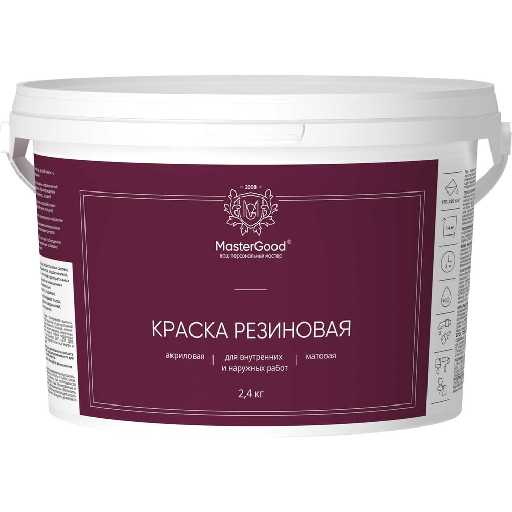Краска резиновая эластичная MasterGood рекомендуется для обработки фасадов зданий, фундаментов, заборов, бордюров, крыш. Отличается стойкостью к воздействию осадков и УФ-лучей. Скрывает небольшие трещины, которые имелись на поверхности до начала проведения работ. СОСТАВ: вода, наполнитель, композиция латексов, пигменты, антисептик.