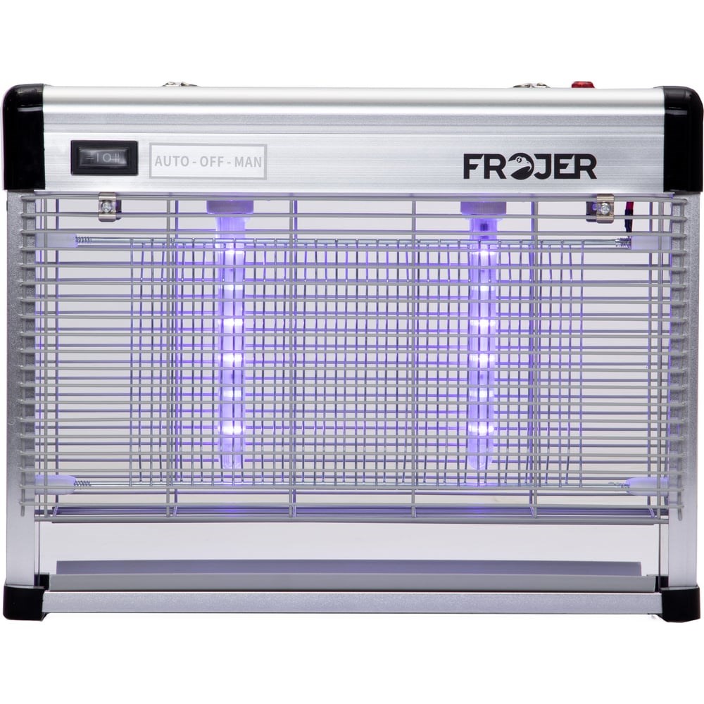 Ловушка для насекомых электрическая Frojer PRO DX20WP - это эффективное и безопасное устройство номинальной мощностью 9 Вт, которое обеспечивает защиту от комаров, мошек, мух, ос, моли и других летающих насекомых на площади до 80 кв. м. (здесь имеется в виду площадь охвата и привлечения насекомых к прибору). Предназначена для использования на верандах, в беседках и в других закрытых жилых, торговых или производственных помещениях. Ее эффективность достигает максимума в темное время суток или сумерки, когда посторонний свет не заглушает фонарь и насекомые наиболее активны. Однако, противомоскитный эффект при свете слабее, чем в темноте, так как лампа становится менее заметной для насекомых и не выглядит для них очевидной целью. Антимоскитная лампа Frojer PRO DX20WP привлекает насекомых ультрафиолетовым свечением в привлекательном для них диапазоне 365-395 нм, формируемым встроенной светодиодной лампой LED, расположенной в центре корпуса. Подлетающие на свет к сетке на расстояние ближе 0,3 мм вредители поражаются тихим электрическим разрядом, который возникает между прутьями, расположенными вокруг источника света. Благодаря этому, электроловушка работает бесшумно и не издает неприятных звуков, что делает его более комфортным для пользователя. Привлеченные УФ светом насекомые погибают при контакте с сеткой, а вертикальное расположение прутков делает ее самоочищающейся - комары, моль, осы, мухи просто падают вниз в съемный лоток.