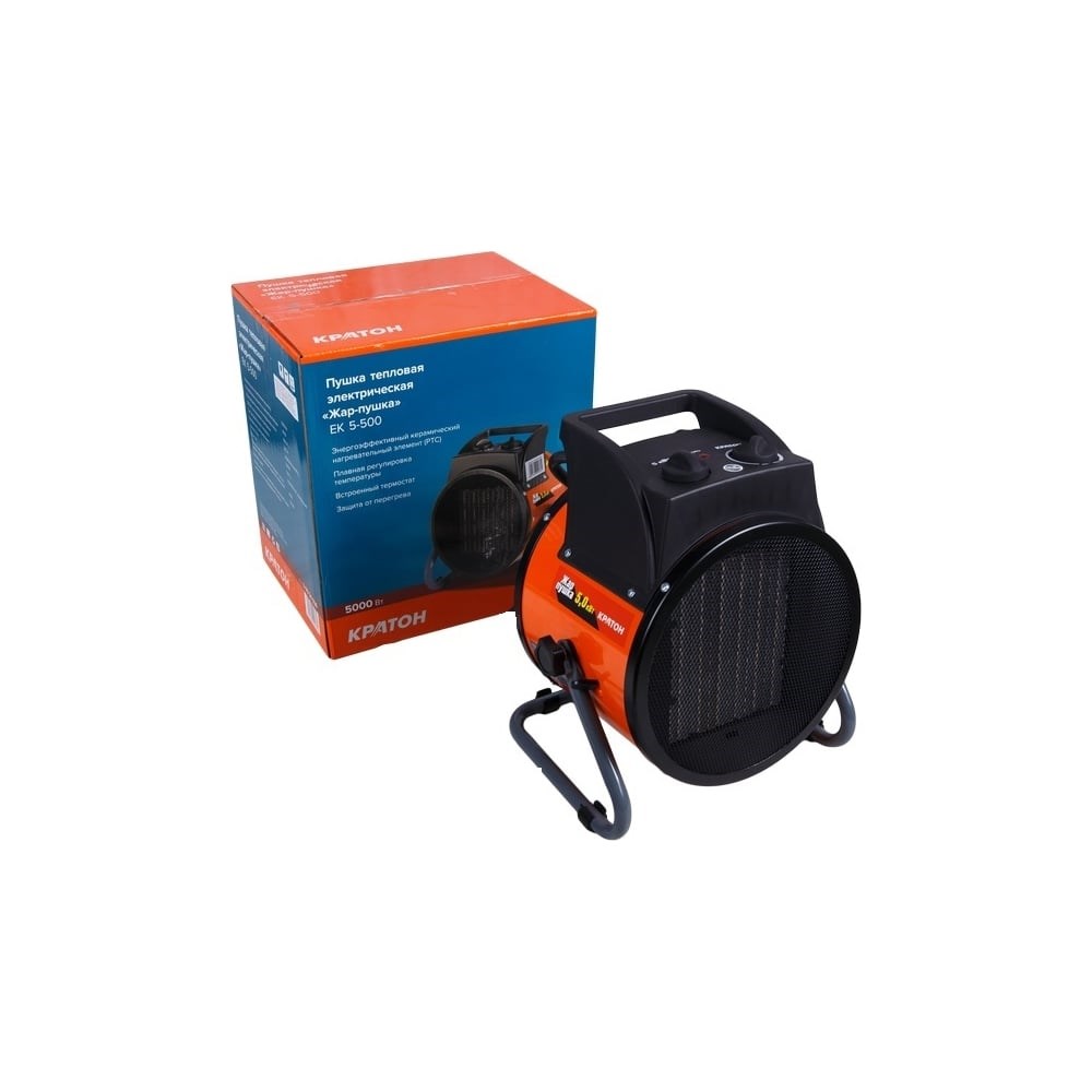 Пушка тепловая электрическая Кратон Жар-пушка ЕК 5-500 оснащена надежным нагревательным элементом, который обеспечивает эффективный нагрев комнаты, предназначена для воздушного отопления и вентиляции промышленных, складских, торговых, общественных, административных и бытовых помещений. Термостойкое покрытие корпуса обеспечивает надежность и долговечность использования. В качестве нагревательного элемента использованы высококачественные ТЭНы, которые обеспечивают эффективную работу и долговечность. Пушка представлена в компактном размере, конструкция оснащена рукояткой, при помощи которой агрегат легко перемещать. Управление простое, температура плавно регулируется.