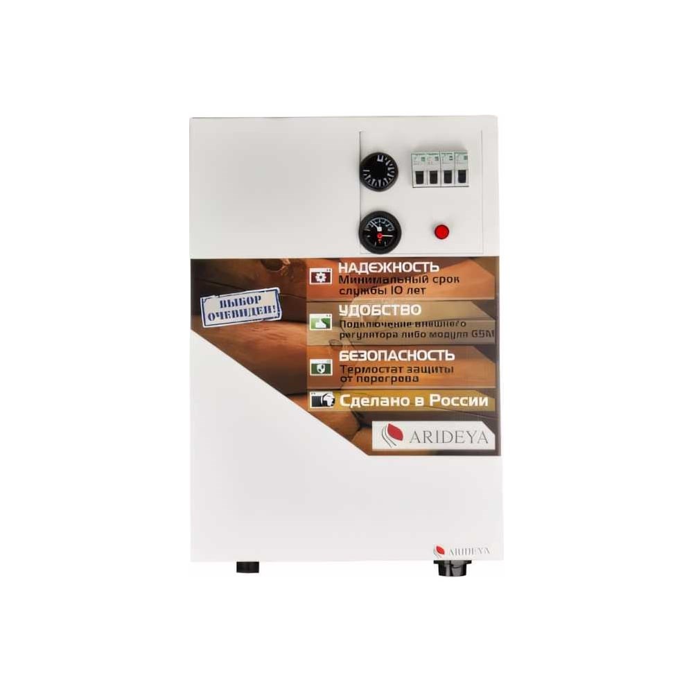 Электрический котел Arideya ARD-09-000001 предназначен для отопления помещений, имеющих закрытую систему отопления, работающих при давлении не более 0,3 МПа. В состав оборудования входит расширительный бак на 8 л, предохранительный клапан, термоманометр, регулируемый и автоматический термостаты, циркуляционный насос, а также автоматический воздухоотводчик. Миникотельная ARIDEYA также может использоваться для нагрева теплоносителя в специальных системах отопления «теплый пол».