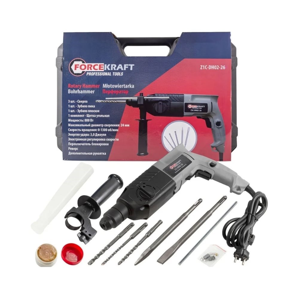 Электрический перфоратор Forcekraft — это надёжный инструмент для строительных, монтажных и ремонтных работ. Он справляется с деревом, кирпичом, камнем и бетоном благодаря мощности 800 Вт, энергии удара 3 Дж и скорости вращения до 1300 об/мин. Максимальный диаметр сверления — 24 мм. Преимущества Мощность и производительность 800 Вт и 2,8 Дж энергии удара позволяют эффективно сверлить твёрдые материалы. Универсальность применения Подходит для работы с деревом, кирпичом, камнем и бетоном — идеален для дома и стройки. Удобство и контроль Эргономичная рукоятка и дополнительная ручка обеспечивают комфорт и точность при работе. Функциональность Реверс и регулировка оборотов позволяют работать с разными материалами и задачами. SDS-plus патрон — быстрая смена оснастки, надёжная фиксация Устойчивость к нагрузкам Резиновый кабель питания устойчив к перегибам, порезам и ударам. Ударопрочный корпус с горизонтальным расположением двигателя Прочный корпус защищает внутренние компоненты от повреждений при падениях и ударах, что особенно важно на стройке. Горизонтальное расположение двигателя обеспечивает компактность и удобство при работе в ограниченном пространстве, а также способствует лучшему балансу инструмента в руках. Надёжный кейс Прочный футляр для хранения защищает инструмент и аксессуары, облегчает транспортировку. Полная комплектация Включает 3 сверла, 2 зубила, ограничитель глубины, смазку, запасные щётки, дополнительную рукоятку и кейс — всё под рукой.
