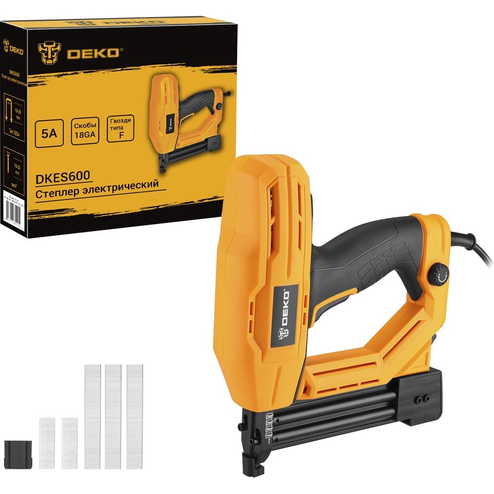 Степлер электрический DEKO DKES600предназначен для крепления тонких деревянных деталей, деталей из масонита или других материалов, требующих надежной фиксации.Технические характеристики:Напряжение: 220-240 В Частота: 50 Гц Ток: 5 А Частота ударов: 40 уд/мин Тип скоб: 18GA (16-25 мм) Тип гвоздей: F, 15-32 мм Тип двигателя: щеточный