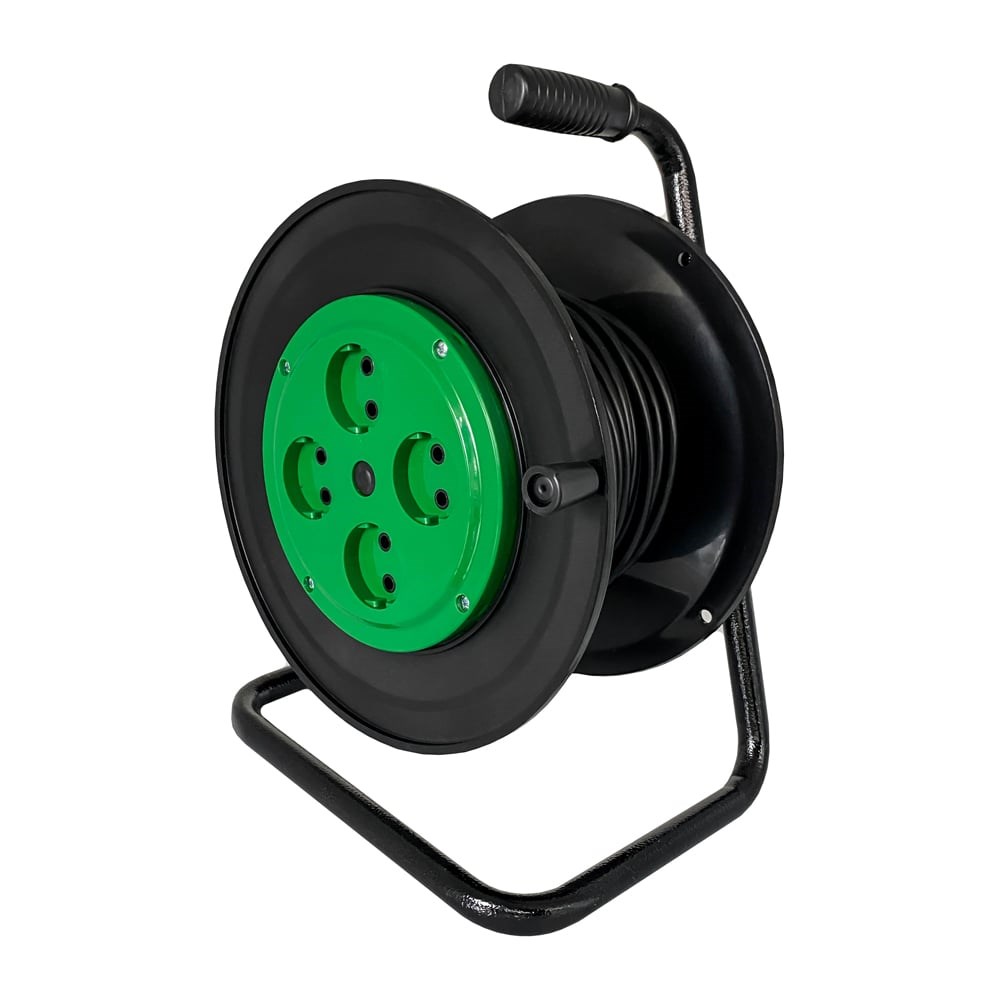 Электрический удлинитель на катушке SVET 50м/4розетки без заземления (КГ 2x1), 10А УХ-10-4-50-К КГ 2x1 3111-10051 предназначен для присоединения электрических приемников, рассчитанных на номинальный максимальный ток до 16 А к питающей сети переменного тока напряжением до 250 В частотой 50 Гц, 2500Вт Удлинитель предназначен для бытового и аналогичного применения в помещениях и вне их при температуре от -40 С до +40 С. Наличие в воздухе паров кислот, щелочей и других агрессивных веществ не допускается!