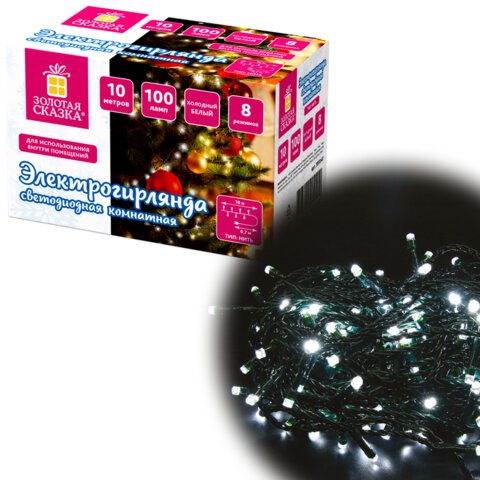 Электрогирлянда-нить комнатная "Стандарт" 10 м, 100 LED, холодный белый свет, 220 V, контроллер, ЗОЛОТАЯ СКАЗКА, 591347