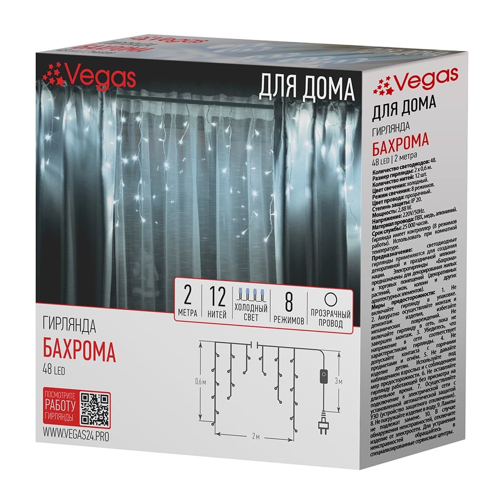 Электрогирлянда VEGAS Бахрома 48 холодных LED ламп, 55113 для декорирования внутри или снаружи помещения.Размер гирлянды 200*60см, длина провода 300 см. Кол-во светодиодов 48. Кол-во нитей 12 шт. Цвет свечения холодный. Кол-во режимов свечения 8. Цвет провода прозрачный. Степень защиты IP 20. Мощность 2,88W.Срок службы 25000 чассов.