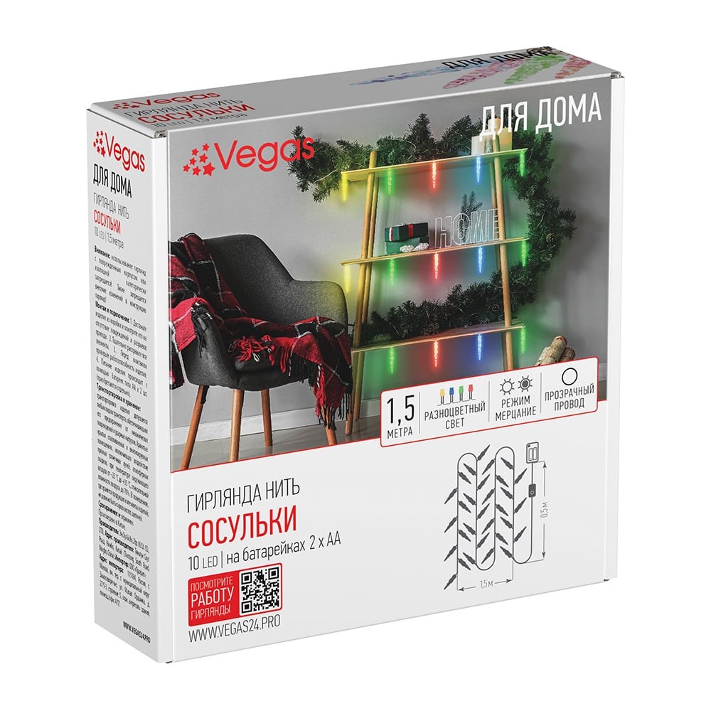 Электрогирлянда VEGAS Нить Сосульки 10 разноцветных LED ламп, 1.5 м 55170 предназначена для декорирования жилых и торговых помещений (елок, декоративных растений, ваз, картин и других предметов интерьера). С её помощью можно также декорировать одежду или прическу. Низкий расход электроэнергии. Использование светодиодов позволяет сократить расходы на электроэнергию до 80%. Длина гирлянды дает возможность создавать различные световые композиции.