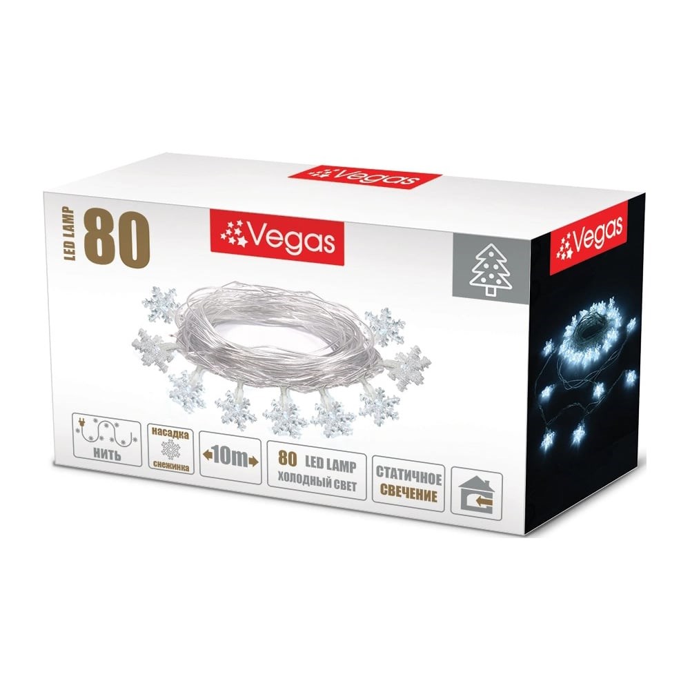 VEGAS Электрогирлянда "Снежинки" 80 холодных LED ламп, прозрачный провод, 10 м, 220 v 55082 для создания декоративной и праздничной иллюминации.Длина гирлянды 10 м, длина провода 1,8 м, количество светодиодов 80.Цвет свечения холодный, режим работы статичный, цвет провода прозрачный.Степень защиты IP 20. Мощность 4,8 W.Срок службы 25 000 часов.Использовать при комнатной температуре.